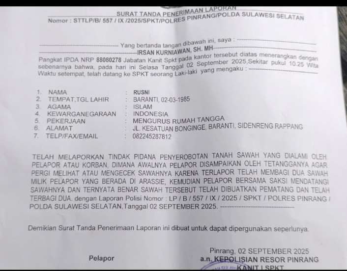 Polres Pinrang Mandul dan Tumpul! Sudah 2 Tahun Laporan Tak Diproses, Sawah Bersertifikat Dikuasai Perampok, Kapolda Sulsel Diminta Turun Tangan